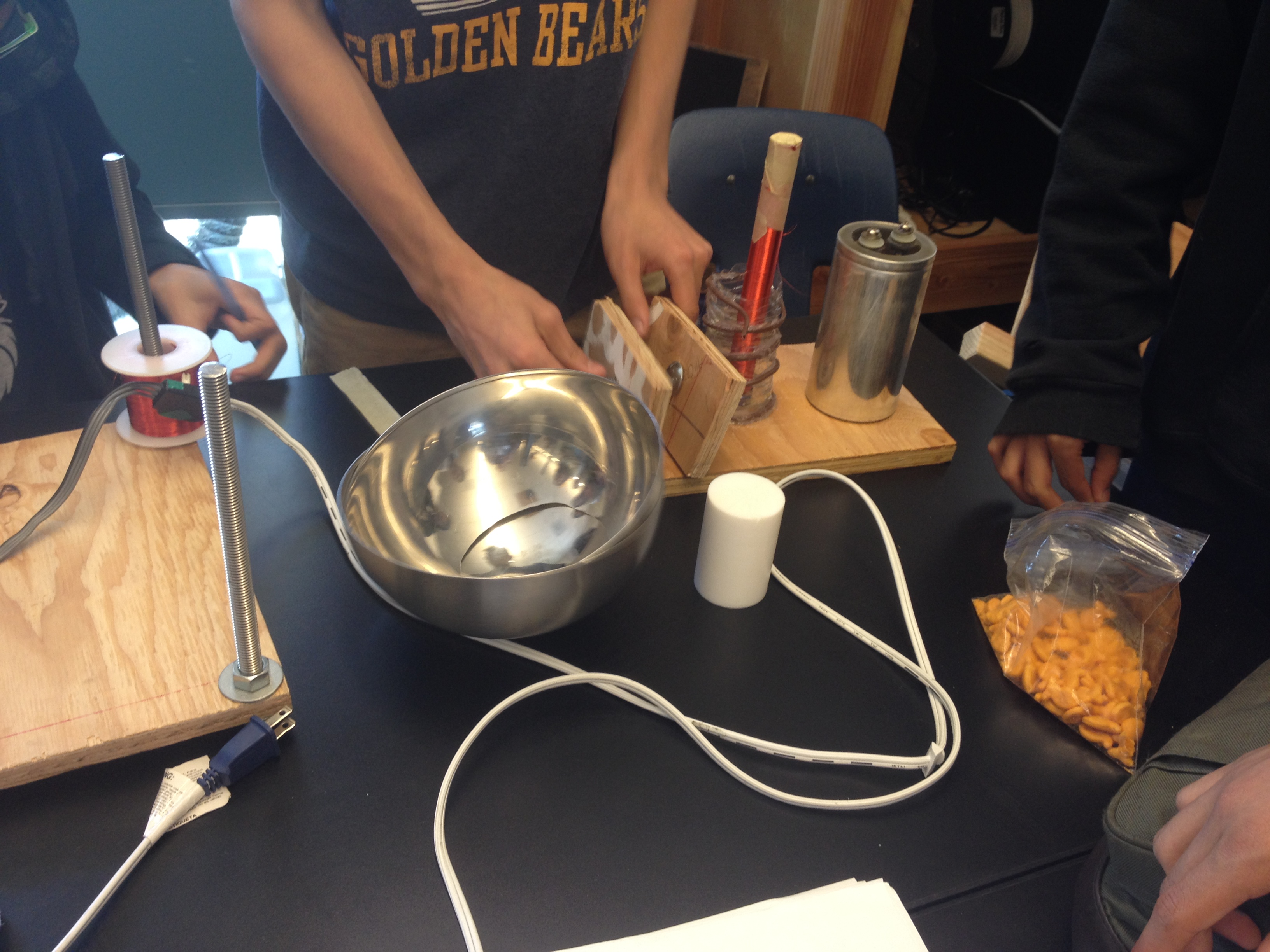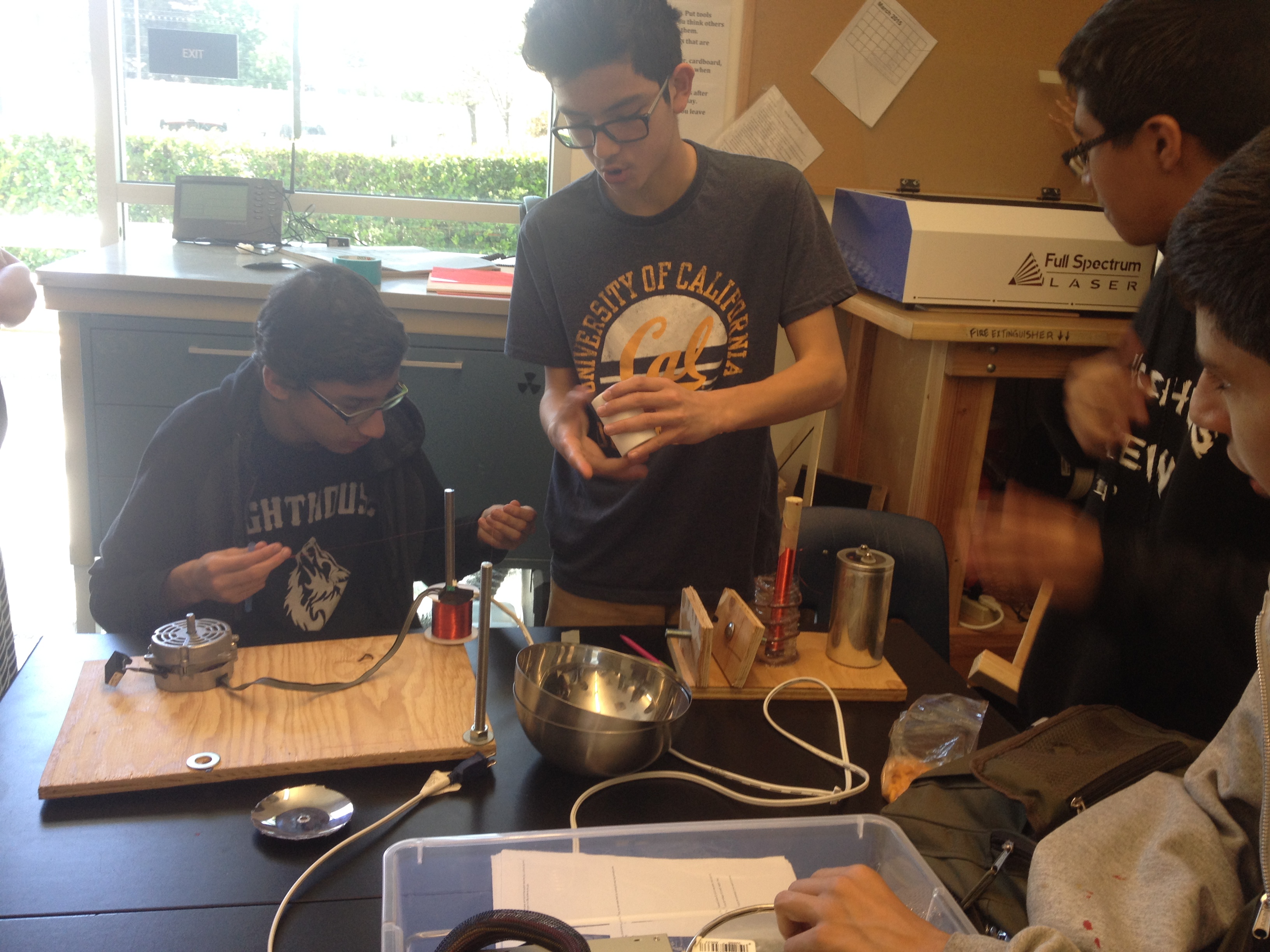At least from my perspective, this is one of the bigger and more complex of our student projects being worked on this year for Maker Faire. A Van de Graaf generator is a machine that builds up an electric charge inside of a metal sphere that sits atop a shaft. The charge can be strong enough that, when touched, the sphere will deliver a shock. I’m almost certain that the opportunity to shock people is why this project appealed to these guys.