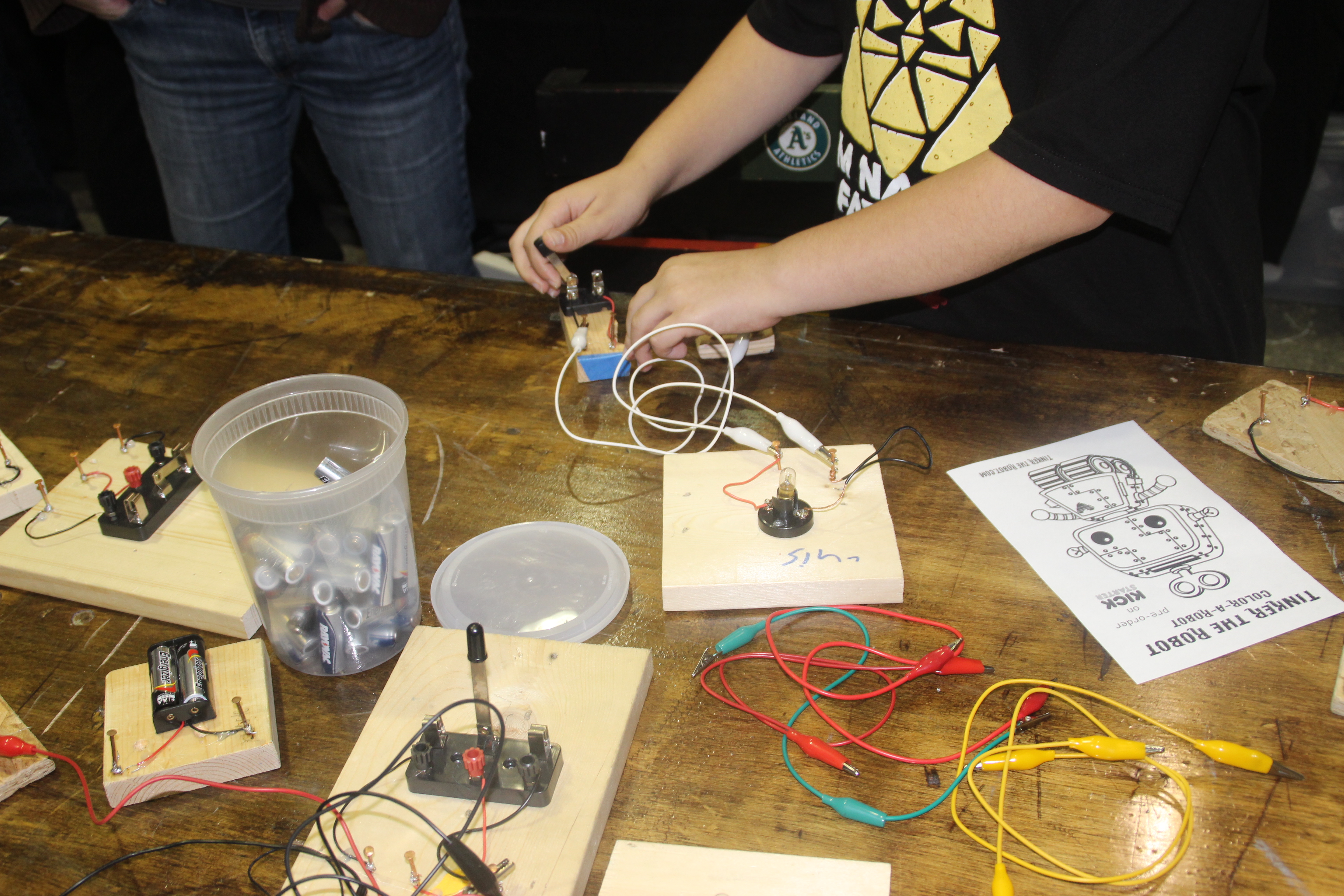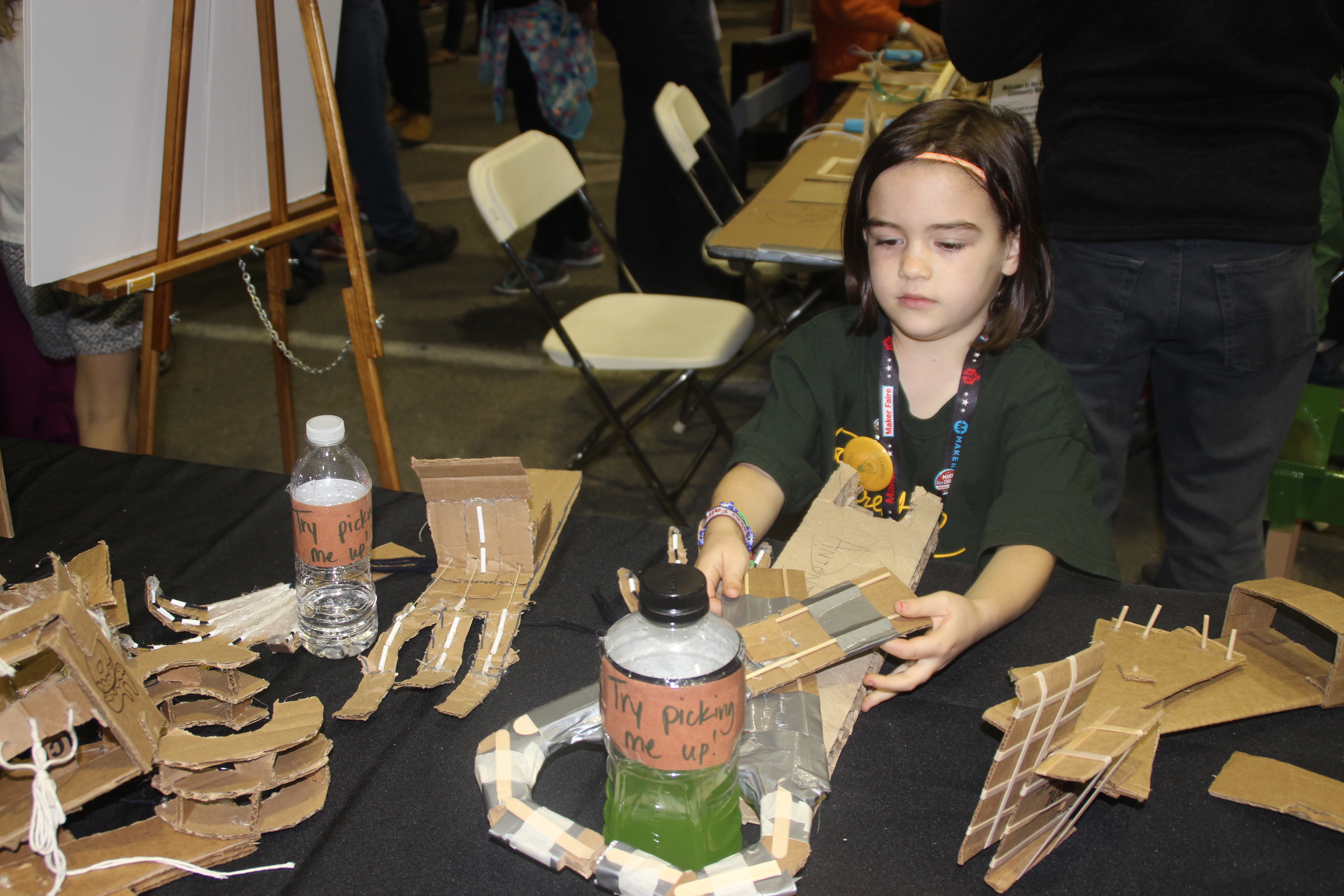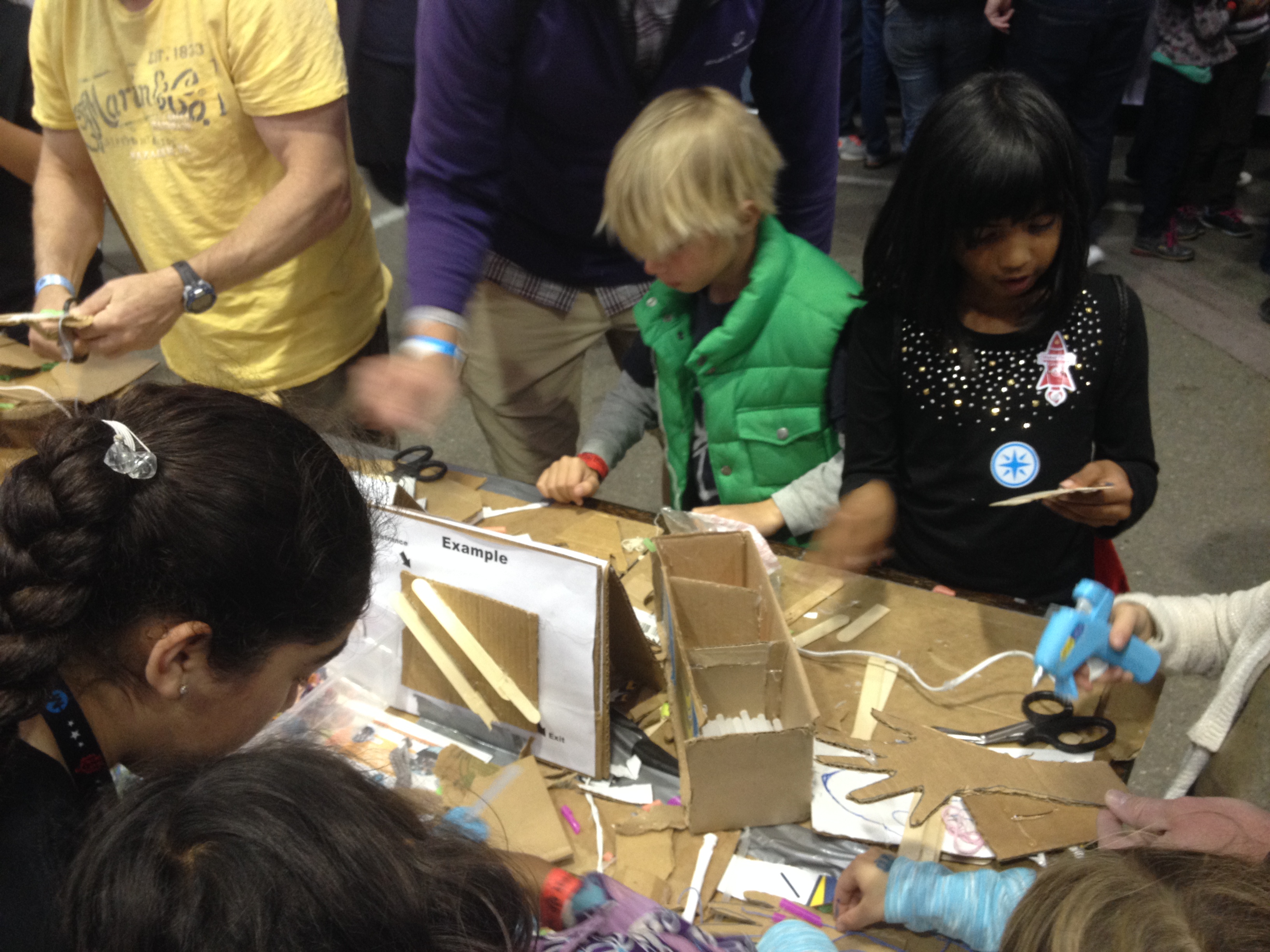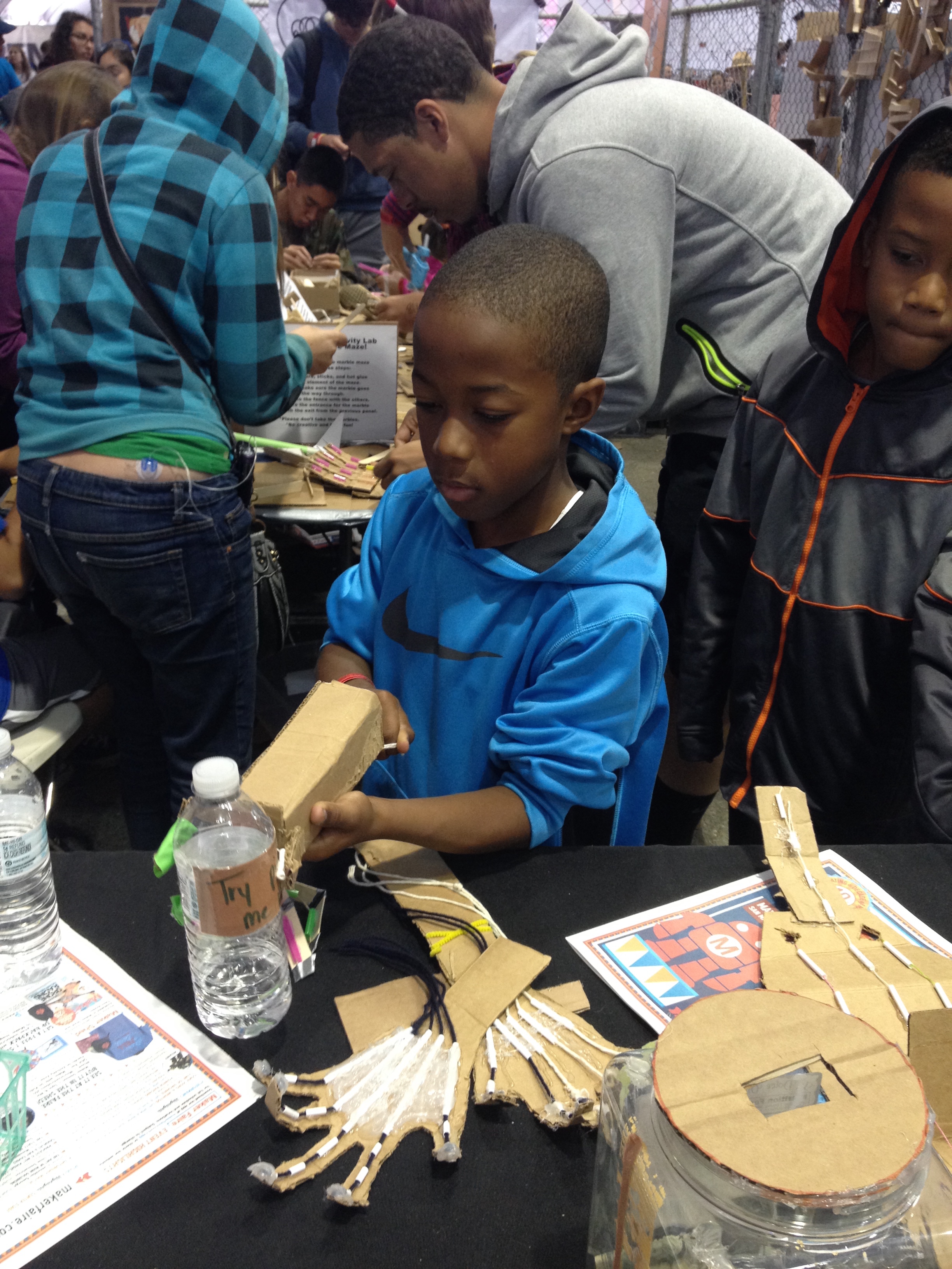 Our goal was both to show off the hard work and creativity that our students have put into their making projects over the past several months, as well as get new makers engaged in the fun themselves. From 10:00 am–6:00 pm, our students got to be the teachers as they helped participants of all ages join us in making marble mazes, cardboard hands, buttons, and circuits: