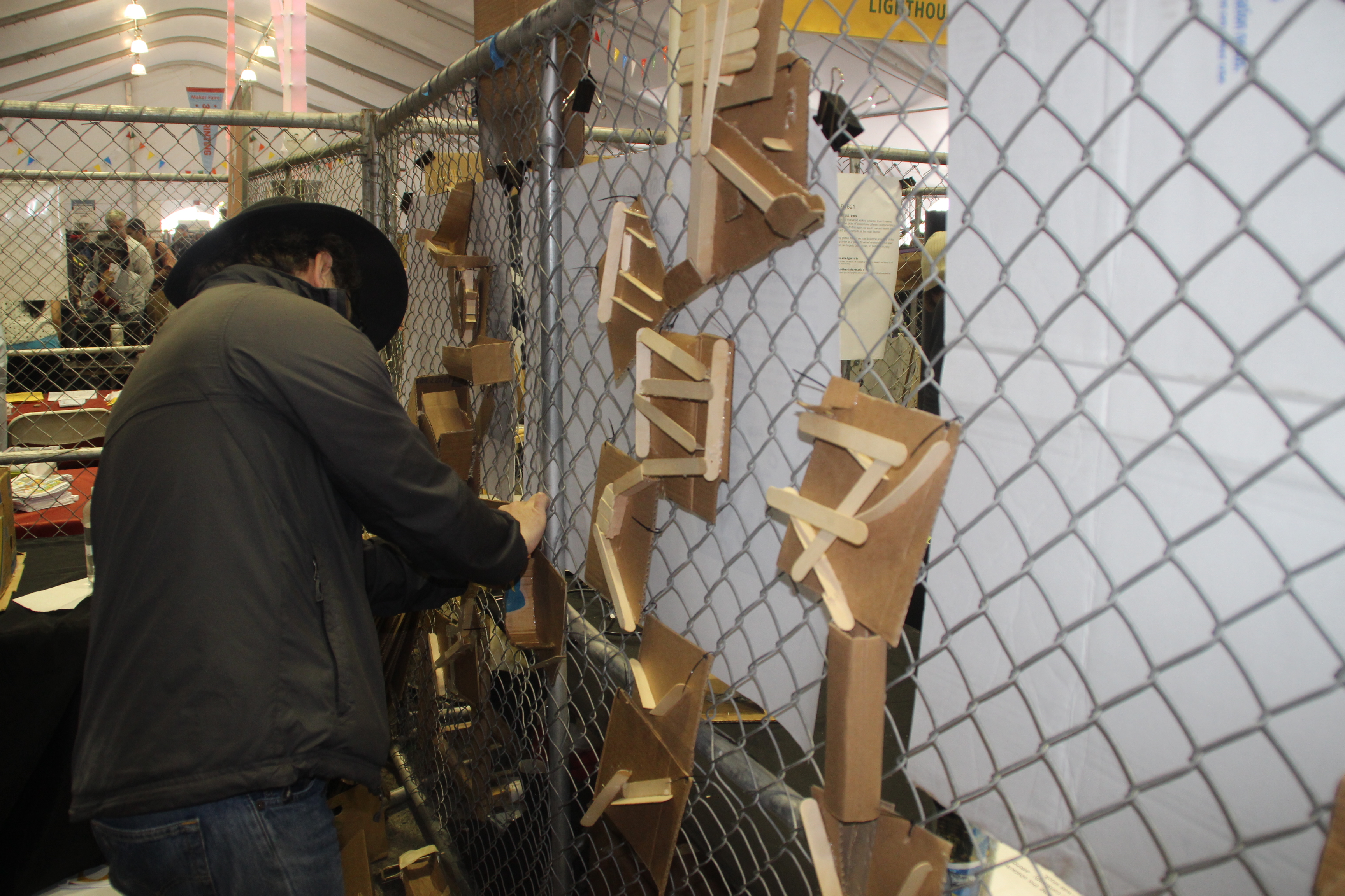 Our 7th graders helped to put this one on. Participants could build their own piece of the maze out of popsicle sticks and cardboard, then tie it onto the wall. It takes some fiddling to get the pieces to line up just right, so that the marble exits from one piece into the other (we had marbles flying all over the place), but that’s making for you, and the challenge involved and persistence required is what makes it so much fun. We had some pretty innovative and unique pieces added to our marble maze. It’s hard to see the marbles actually going through the maze (they’re small, and the quality of the filming ain’t so great), but the video below will at least give you some idea of what we built: