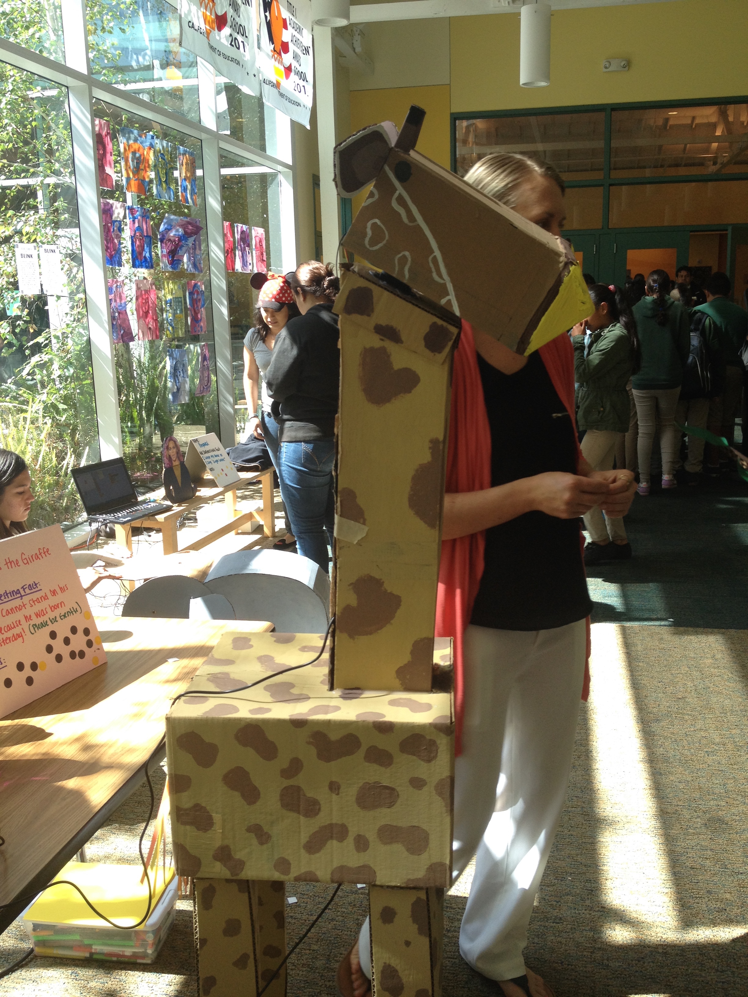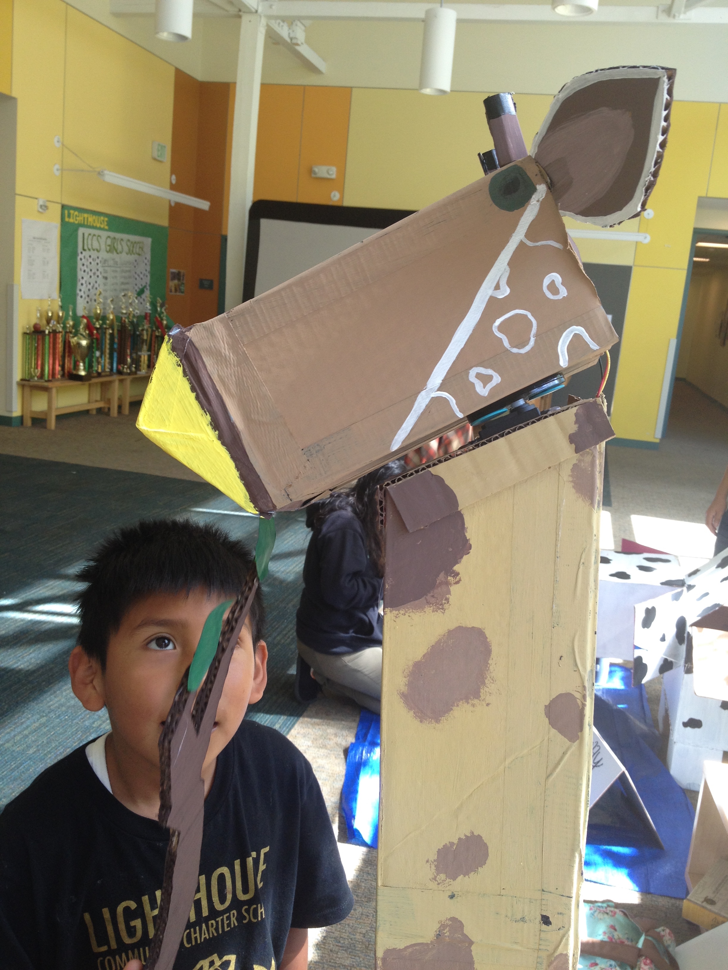 A: The other groups drew stencils of their animals first that they kinda built around. We just started stacking boxes of cardboard, like a snowman. But as we went further into the project, we realized that it’s okay to have different creative ideas about how to build our robots.