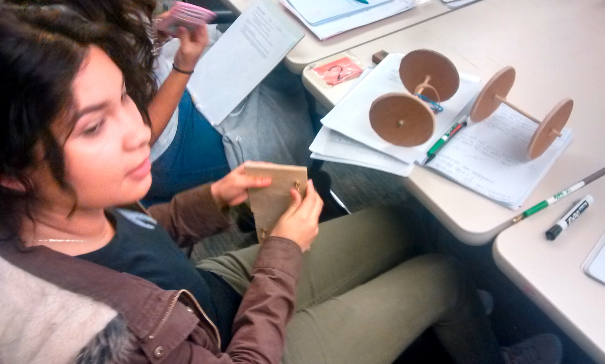 - A student uses her physics notes to make alterations to her mousetrap car design